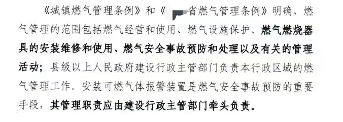 文中明確了建設(shè)行政主管部門(mén)“燃?xì)夤芾怼钡姆秶?,安裝可燃?xì)怏w報(bào)警裝置,是燃?xì)獍踩鹿暑A(yù)防的重要手段,其管理職責(zé)應(yīng)由建設(shè)行政主管部門(mén)牽頭負(fù)責(zé)。